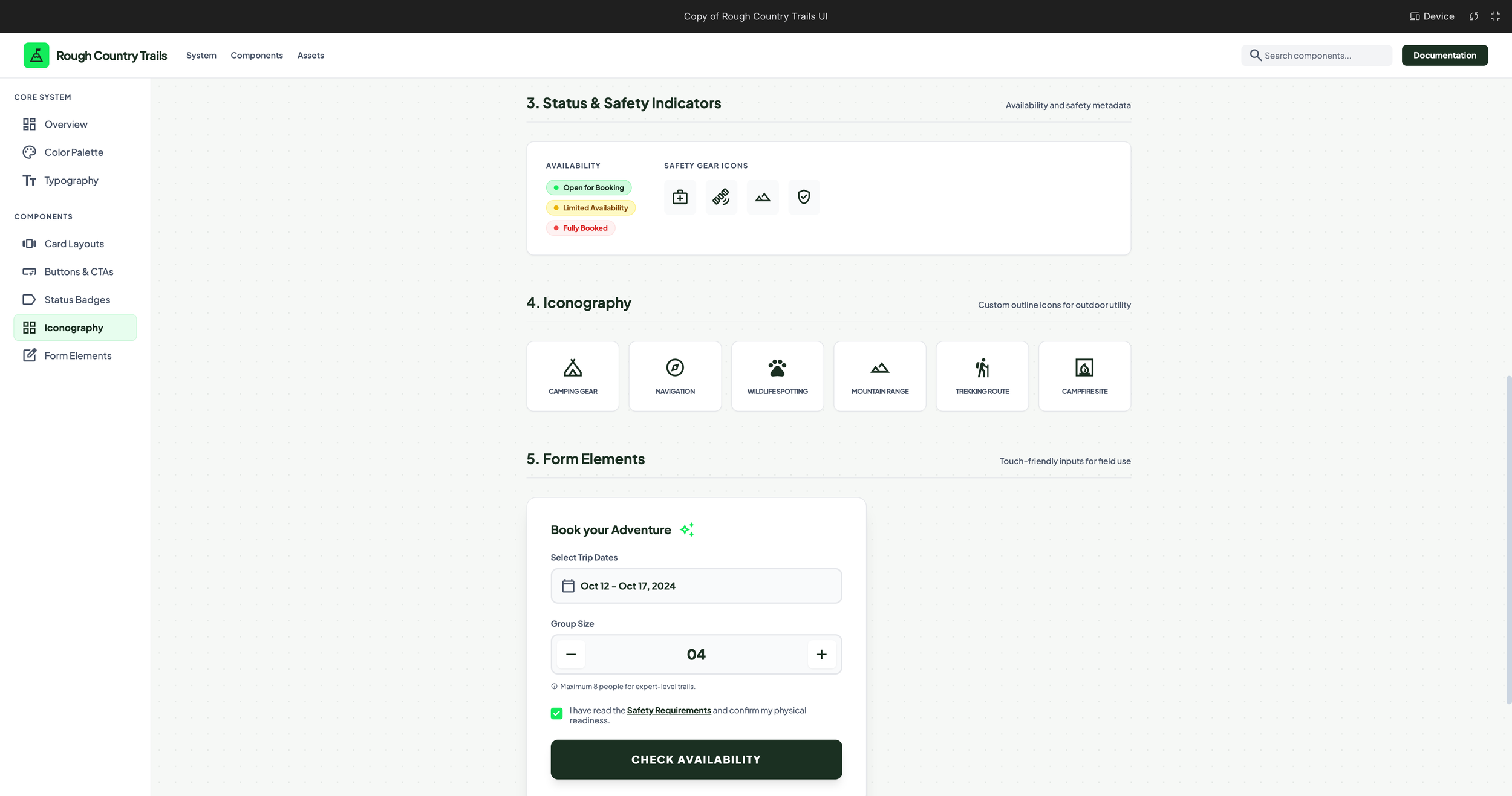 This step defines the reusable interface elements that power the Rough Country Trails experience across web and mobile. These components are designed to balance rugged outdoor aesthetics with modern usability and clarity.